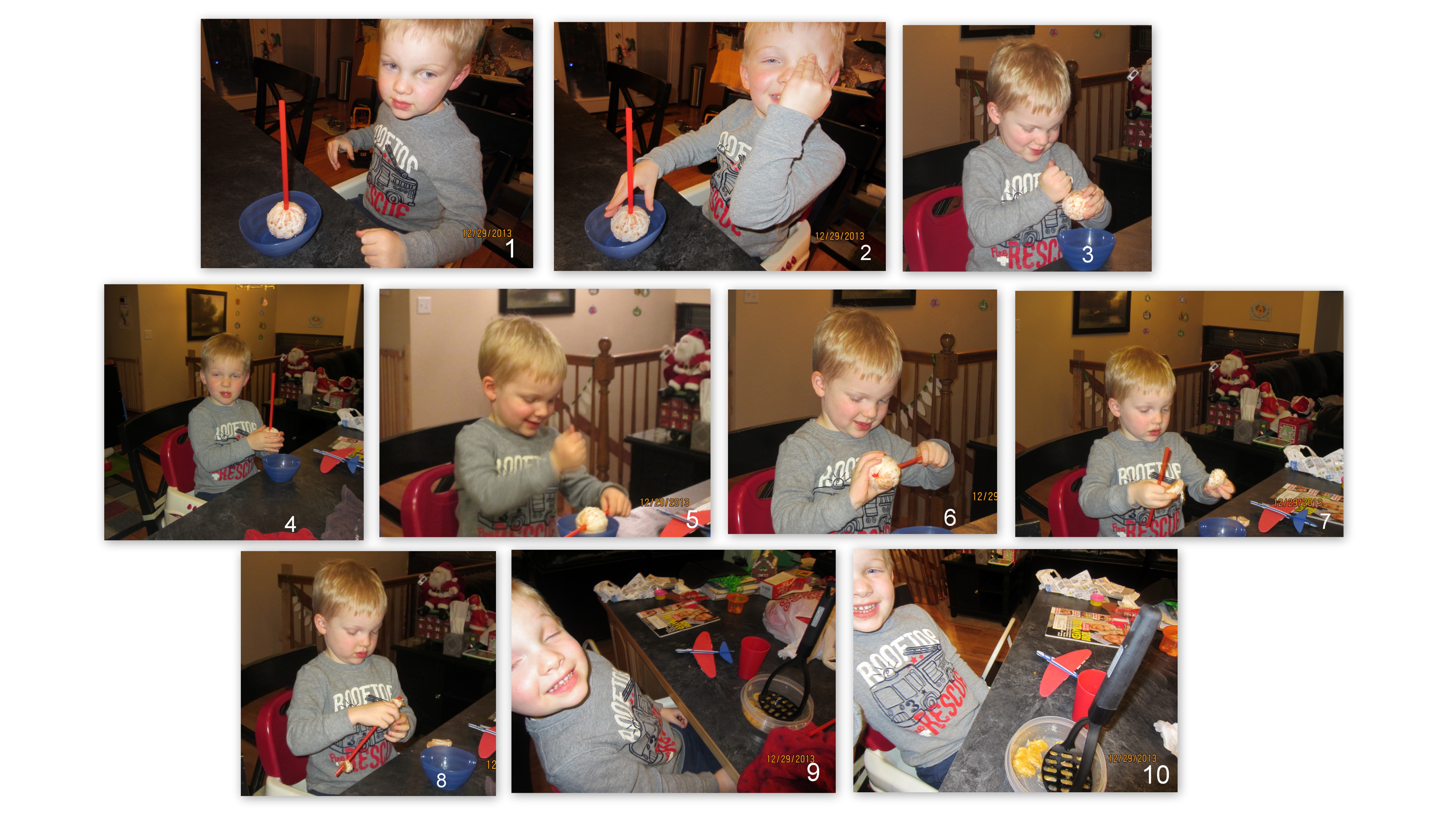 S asked me for an orange, no problem I can peel an orange for you so you can eat it. Unfortunately, after I peeled the orange, S got upset because he wanted to drink juice out of the orange and not eat it. He was so convinced because there was already a whole in the center of the orange. Okay I’ll play along and give you a straw (1). S was only too happy to stick it in the orange. After trying to drink some orange juice he was a little embarrassed because he didn’t get anything (2). I kept telling him you can’t get juice by just sticking a straw in the orange. S then proceeded to tell me that you have to hit the orange to create juice (3). He is getting close, but not close enough yet. When he tried sticking the straw in again he got no juice (4). Now he lets me know you have to stick the straw completely through the orange to get juice. Then you put it over a bowl in case it makes a mess and hit it some more (5). Now that he finished he was sure he could get juice by putting the straw back in the orange (6). Nope didn’t happen. S said maybe if we take it apart we will be able to get juice (7). He somehow thought if you spear the orange sections it would create juice (8). When I asked him if he had juice yet, he said just a little bit. Okay so at this point I thought he may be ready to listen to what I have to say. So I asked him if I could help him make juice. Now he was only to happy to listen to what I have to say. I told him to put the orange sections in the bowl and we will mash them like we do potatoes. All of a sudden a light bulb must have turned on for S because he finally got it. He did not want me to do the mashing so he proceeded to mash the orange himself (9). He had a hard time tipping the bowl and keeping the orange chunks away so that he could drink the little bit of juice he made. Once he drank every last drop of juice we could get out of the orange he was a smiles (10). I think maybe we got a teaspoon if we were lucky. S didn’t care and was only too happy to tell B he made his own orange juice when we called him at work to say good night.